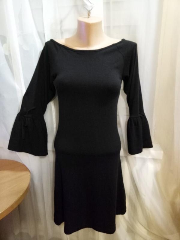 черное, состав вискоза, эластан тянется хорошо, размер S, M, замеры:рукав от горловины 51, длина 85, обьем грудь от 35-40, талия35-45, низ 52(немного клеша)