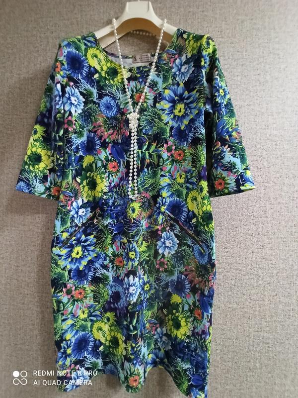 Элегантное нарядное платье с модным ярким принтом в цвети. Простой крой и хорошая посадка – залог идеального образа в жизни современной женщины. Ткань эластичная, приятная в носке, хорошо тянется. Два кармана-обманки .