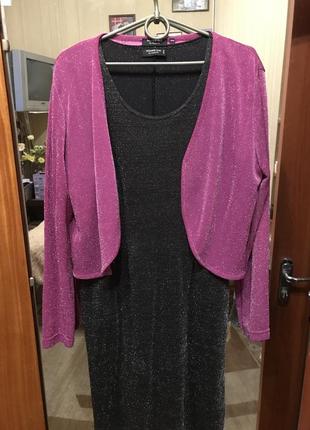 Очень красивое нарядное платье с мелкой ниткой блестящий люрекс по груди 43 по поясу 42 длина 95 замер в спокойном состоянии ,ткань хорошо тянется, ну очень красиво лежит по фигуре.Без зацепов,дыр и пятен.Лежит без надобности!!Можно носить как с пиджаком,так и без него!!