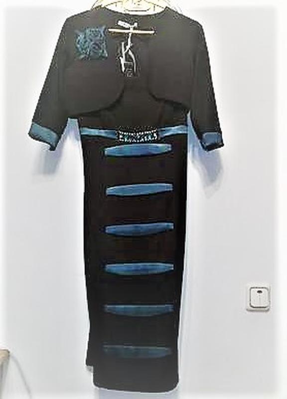 Платье-костюм состоит из платья на регулируемых бретелях и болеро с рукавами 3/4. Платье нарядное, благодаря украшениям: атласные бирюзовые полоски и стразы на платье, украшение в виде букетика на полочке болеро. Застёгивается сбоку на молнию. Фасон: платье-футляр, красиво облегает фигуру. Абсолютно новое, с бирками.