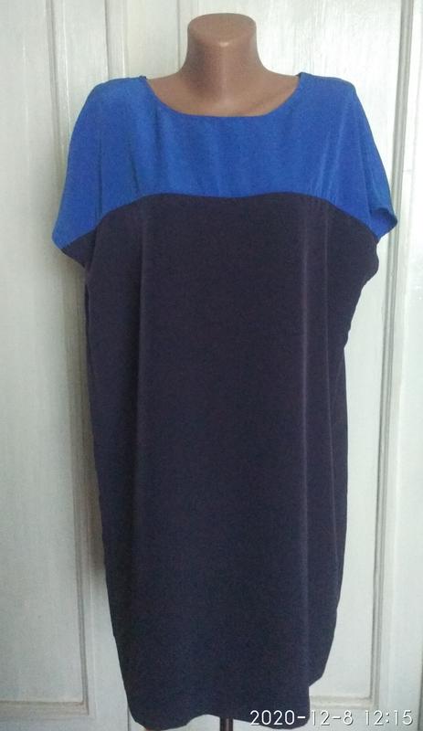 Платье комбинированное верх ярко синего цвета,низ темно синего.Фасон прямой,размер указан 16,но отлично сядет на14.В хорошем состоянии.Замеры:пог-58,пот-58,поб-58,ширина внизу-58.Длина платья по спинке-90см. Ткань:100%полиэстэр.