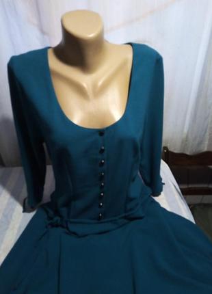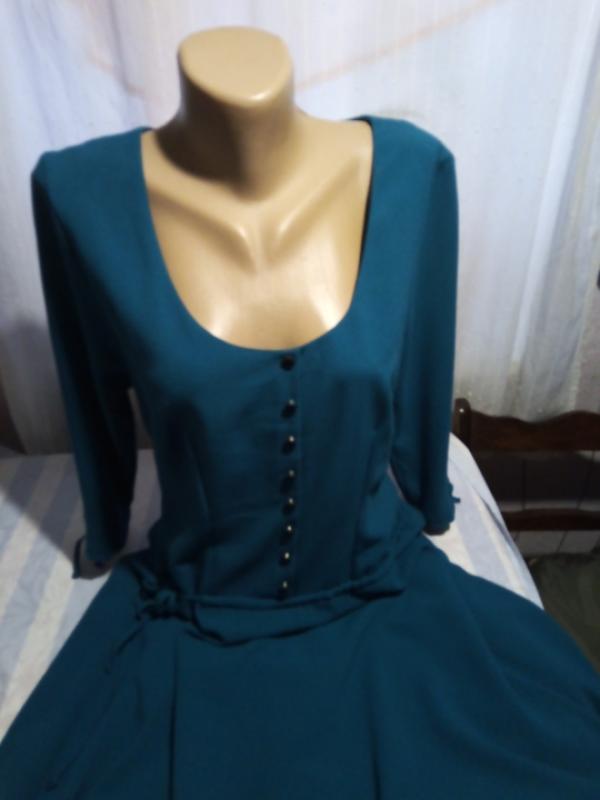 Очень красивое платье из плотной, но спадающей ткани со спущенной талией на кулиске , рукавом 3/4 и расклешенной юбкой. Замеры :длина по спинке 100(змейка до юбки). На рост170- 172 будет чуть ниже колена. Плечи 39,пог 50,пот46,рукав 46, бедра свободно. Рукав на кулиске. Есть легкая подкладка. Состав :полиэстер, вискоза, эластан. Цвет на фото искажен. Он глубокого тёмно - бирюзово - синего цвета(ближе к последнему фото).