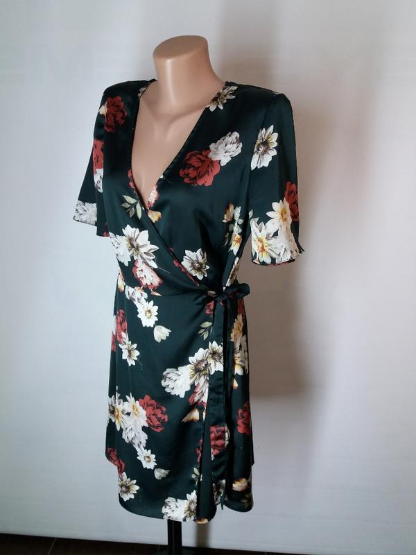 Красивое платье на запах изумрудного цвета в цветочный принт от бренда new look