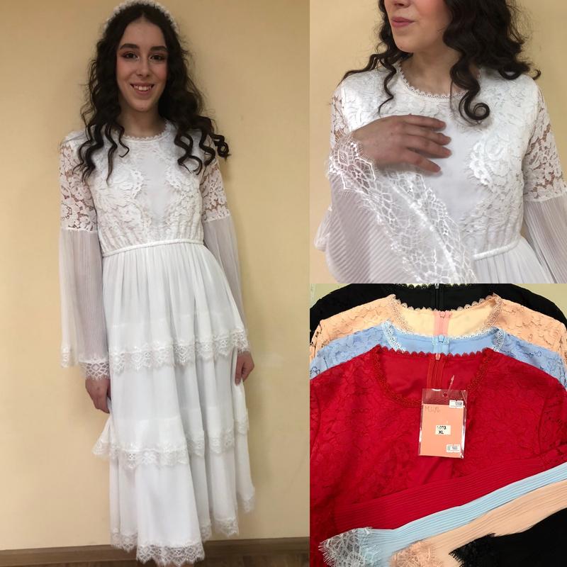 Дуже гарні святкові сукні в кольорах: білий, чорний, блакитний, пудра, червоний. Розміри: М,L,Xl. М: ПОГ 43см, ПІТ гумка, ПОБІДИ вільні, довжина 114см, рукав 66см Л: ПОГ 45см, довжина 115см, рукав 66см ХЛ: ПОГ 48см, довжина рукава 66см, довжина 116см