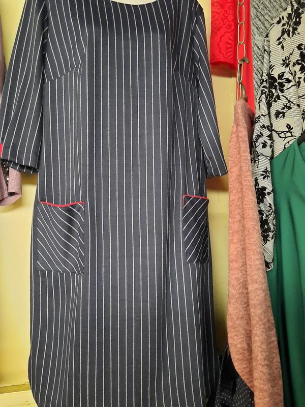 Красивое элегантное платье в полоску.Дополнительные элементы красный цвет в сочетании с синим смотрится очень классно. В реале намного красивее)))