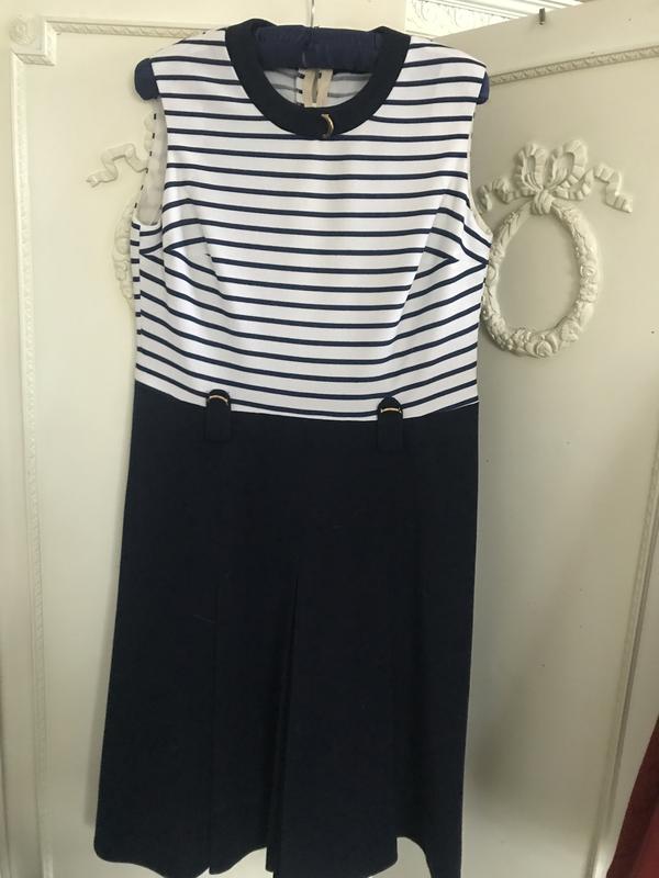 Стильное платье длиной миди. Приехало из Англии. Красивое и всегда выигрышное сочетание белого и темно-синего, красивый фасон: без рукавов, красивый декор у горловины и по линии талии, застежка-молния по спинке до линии бёдра, юбка спереди имеет три складки. Ткань чуть тянется{синтетический трикотаж}. Без бирок, Замеры:длина-103 см, ПОГ-49 см, ПОТ -42см, ПОБ-54 см. Очень стильное!