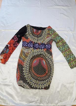 Платье на подкладке 44 размера, маломерит.. Бренд Desigual. ПОГ 48 см, ПОТ 42 см, ПОБ 52 см, длина 94 см. Юбка внизу собрана резинкой.