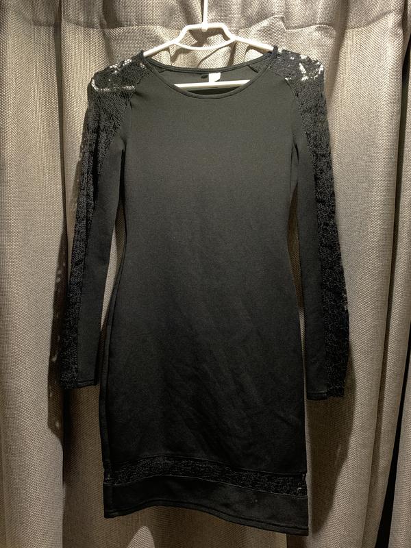 Обтягивающие чёрное платье, кружева смотрятся очень элегантно на теле, ткань достаточно плотная, не просвечивает. Лучше всего сядет на худенькую девочку xs