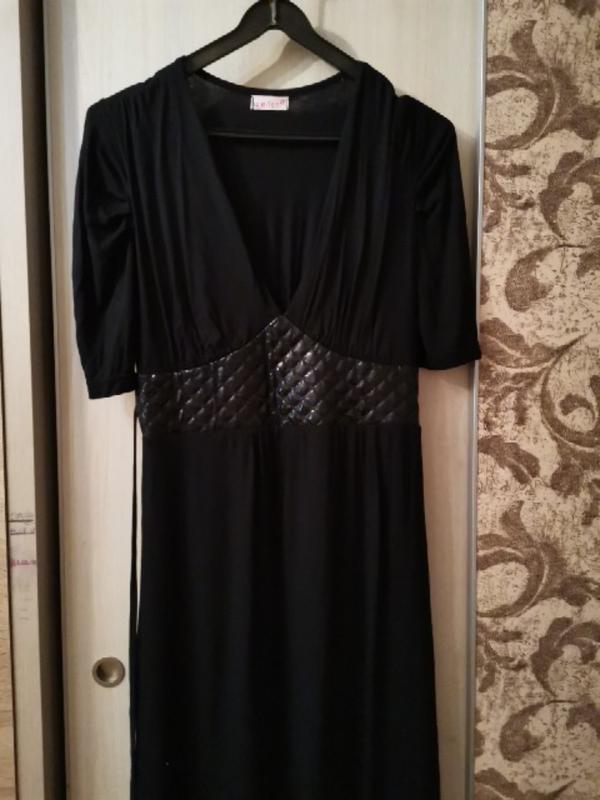 Шикарное платье со вставкой из ласковой искусственной кожи. Очень стильное, подойдёт на разные случаи. Рукав 3/4. Замеры Длина 107 см Ширина под проймой 44 см в нерастянутом виде. Ширина талии 36 см Платье из вискозы, хорошо тянется, красиво ложиться по груди подчёркиваю женские формы - грудь и талию.