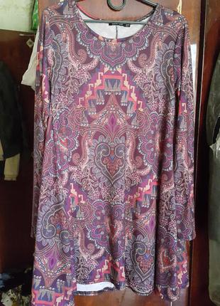 Стильное расслабленное платье, бохо-стайл. Красивый принт. Смотрится отлично! Качество бренда! Длина спинки 81, перед 78, между плечами 39. Длина рукава 63, плечо 9,5.От подмышки до подмышки 46, Пот 55, полуобхват низа 103