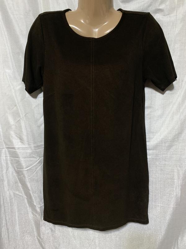 Платье прямого кроя, перед платья из ткани под мягкую замшу, спинка трикотажная. Замеры: длина - 80см., плечи - 39см., рукав - 23см., ПОГ - 46см., ПОТ - 46см., ПОБ - 48см