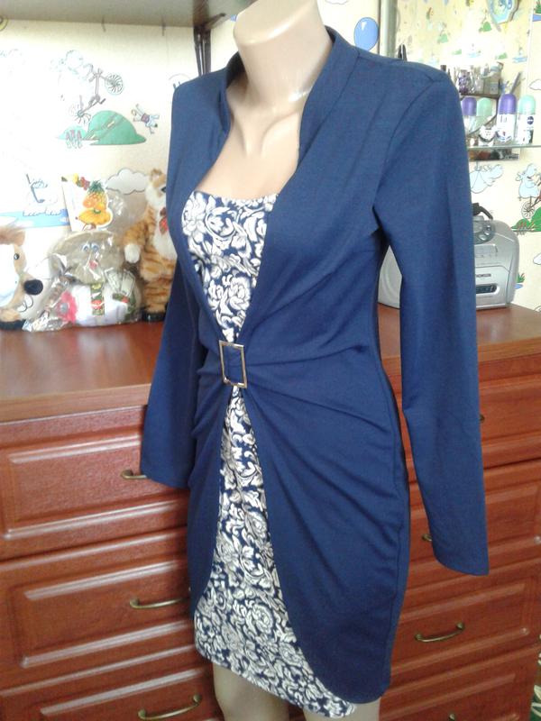 Новое,но без бирки.В реале очень эффектное и красивое,цвета более насыщенные.Спереди,как одно платье сверху с кардиганом,сзади однотонное. Длина от плеча 93,ПОГ 43.ПОТ 35.ПОБ 45,рукав 59+ 9 плечо. На бирке указан 44р,пойдет и на 46,ткань тянется.
