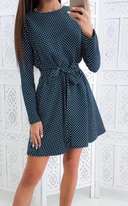 Нове плаття з біркою в горошок. Вільний крій. Тканина м'яка костюмна. Довжина плаття 84 см, рукав довжина 59 см, плечі 36,5 см, колір глибокий зелений (морська хвиля).