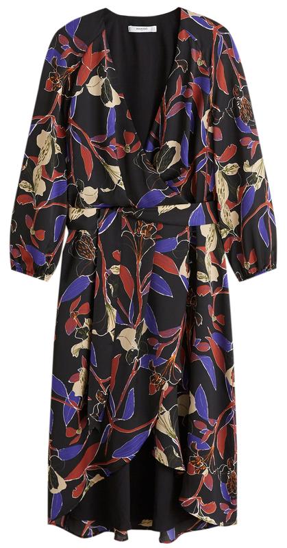 Черное платье в цветочный принт бренд Mango,размер L,новое,платье на запах ,есть пояс. Рукав реглан три четверти длина рукава от верха горловины до конца-61см. ПОТ-42см. Длина платья со спины 117см. спереди подол платья закруглен.Платье на подкладке. Состав: полиэстер 100% Обмена или возврата нет.