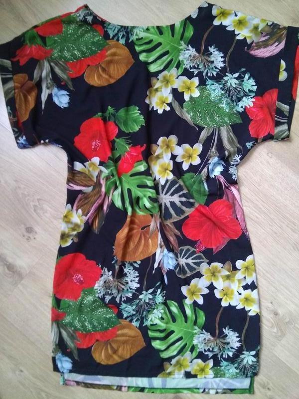 Комфортное легкое прямое летнее платье итальянского бренда new collection в яркий цветочный тропический принт. Перёд по фасону чуть короче спинки по типу длинной туники-футболки. Рукав цельнокроенный, приспущенный. На спинке капля, завязывающаяся на бантик. Платье комфортное, практически не мнется. Смотрится шикарно в любой ситуации. Длина переда 96 см, спинки 101 см ПОГ 58 см ПОТ 55 см Низ 55 см Чтобы угадать с размером, желательно ориентироваться на свои размеры и мои замеры в объявлении Платье не ношено, без изъянов. Бирки нет