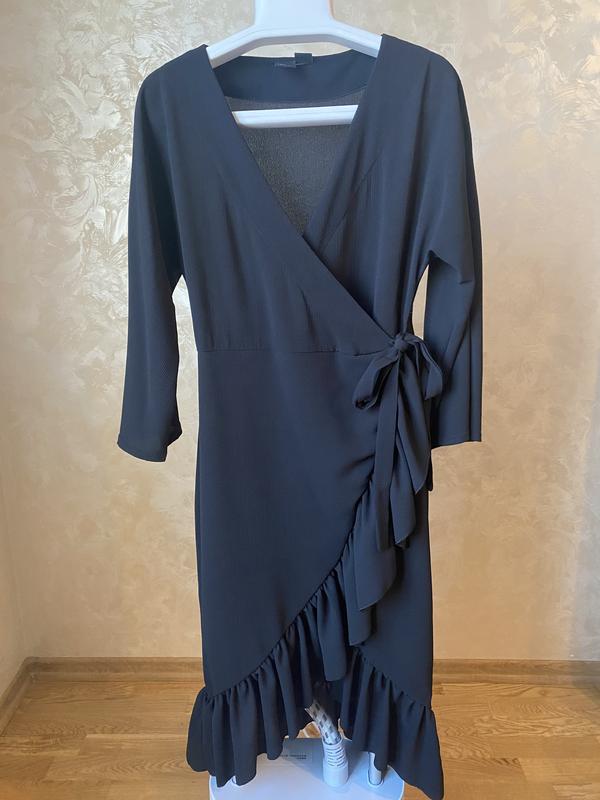 Красивое черное платье на запах длины миди. Размер xs, но хорошо будет и на s. Низ идёт с подкладкой. Рукав три четверти.