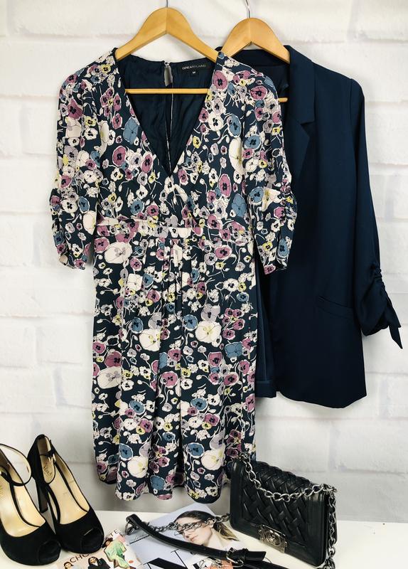 Красивое платье миди в цветочный принт. Укороченый рукав присобран, v-образный вырез, выточки на груди, сбоку молния, сзади на пуговице и ещё несколько декоративных пуговок, подкладка. Качество отменное! Длина 94 см Длина рукава 37 см ПОГ 38 см ПОТ 36 см ПОБ 46 см Платье- это такая вещь, которая должна сидеть идеально. Поэтому, если вам не хватает замеров, пишите, буду рада ответить}} Подписывайтесь на мои обновления, много платьев в наличии. И постепенно обновляю.