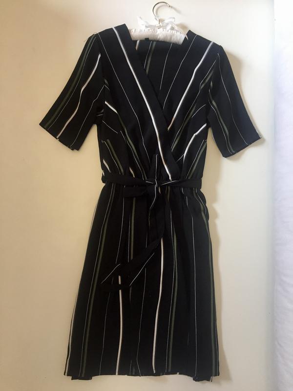 Воно дуже класне, забарвлення трендова - стильна вертикальна смужка, спідниця зроблена з запахом, на грудях V образний виріз Довжина сукні 92., до талії 41., від талії до низу 51., пог 42/43., піт 32+ гумка