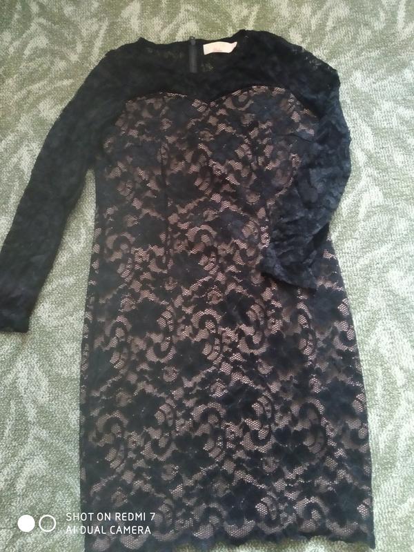 Бежеву сукню з верхнім шаром чорного гіпюру. Гарно сидить на фігурі, рукави повністю гіпюрові