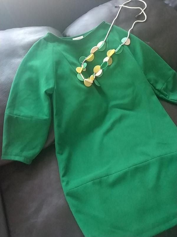 стильное,элегантное платье,красивый зелёный цвет.Заявлен 34. ПОГ46Рукав от горловины 54 ПОБ 49 Ширина внизу39 Спереди два едва видимых пятнышка,фото их даже не показыввет.