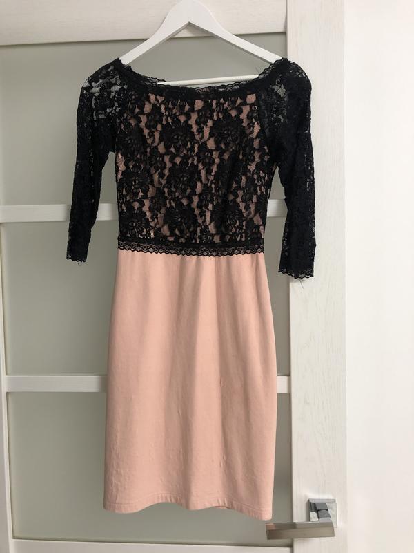 Платтячко ніжного пудрового кольору, верх чорний ажур. Стан ідеальний, одягала 1 раз. Довжина від плеча 88 см.