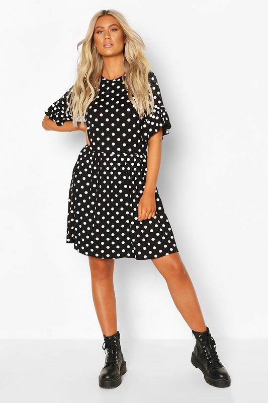 Из коллекции «Tall» — свободное платье со сборками в горошек