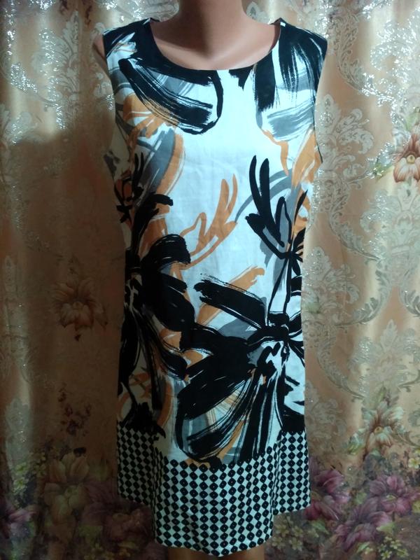 Без рукавів. Гарний прикид на літо. Є підкладка. 60 льон, 40 котон. Об. Грудей 100 см. Талія 94 см. Бедра 102 см. Довжина 93 см.