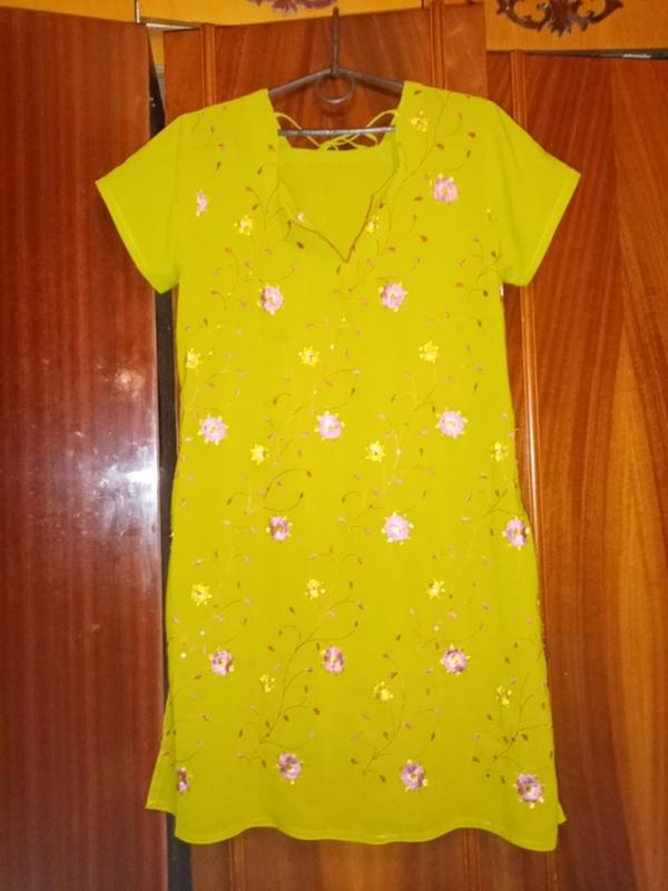 Яркого салатового цвета, с вышивкой. Ткань шифон, плотный. Дефектов нет. Размер 42-44.