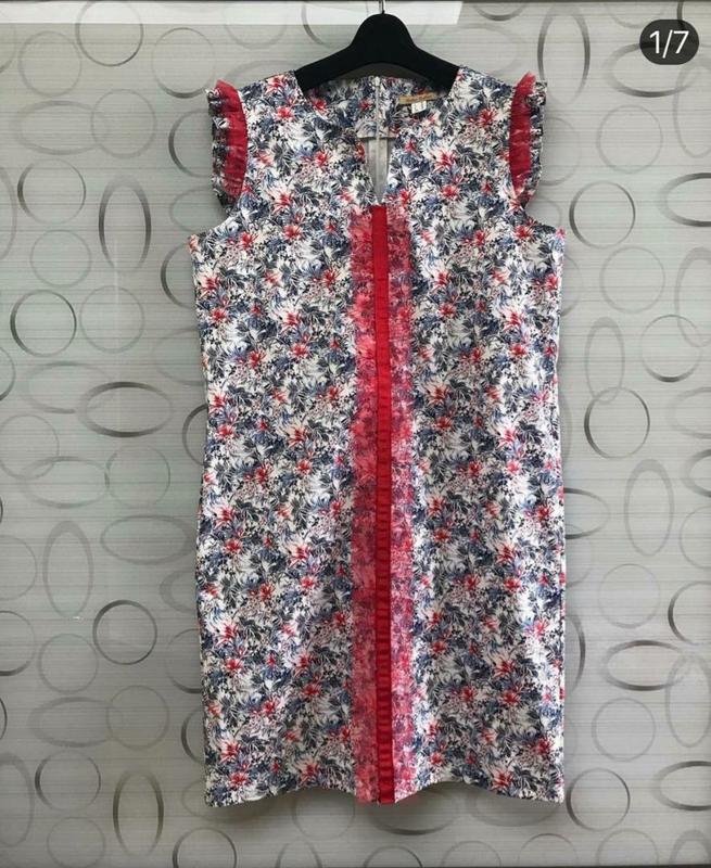 Платье, коттон, с красным красным рюшем из нежной сеточки,сбоку карманы, Италия