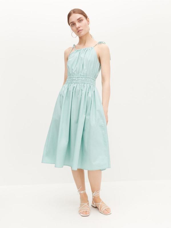 Платье мятного цвета. Талия регулируется с помощью вшитой резинки. В боковых швах есть карманы. Шлейки-завязки - длина регулируется (в среднем 118см). Размер S. Состав материала: 100% хлопок. Обхват груди 102см. Платье одевалось 1 раз.