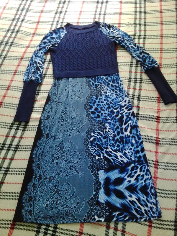 Отличное платье обманка. Верх вязаный, низ трикотаж. Цвет синий. Пог37, Пот35, Поб46, Дл100, Дл рукава от подмышки 50. Хорошо тянется. Подойдёт на 42-46