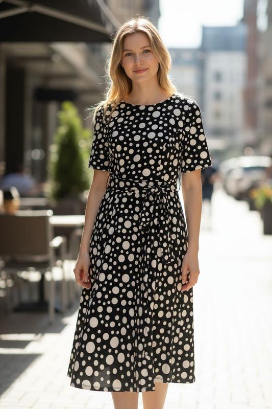 Платье миди в горох Bonmarche р. 16 (р. XL) Эластичная ткань, хорошо тянется, с пояском. Замеры: длина от плеча 105 см ПОГ 51 см (тянется до 57 см) рукав-29 см плечи 40 см (тянется до 43 см) ПОТ 46 см (тянется до 52 см) ПОБ 68 см (+ тягнеться )