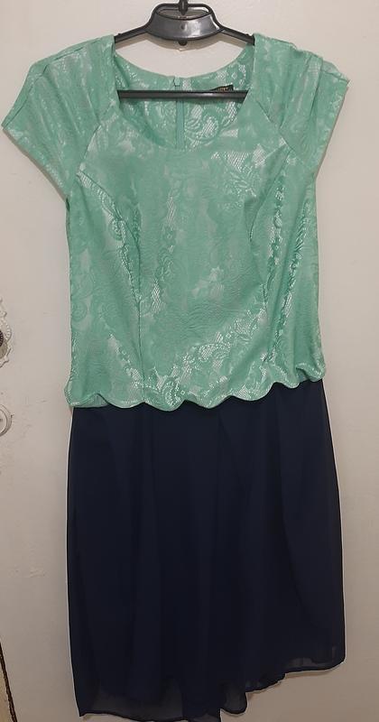 Літня сукня-обманка. Верх бірюзове мереживо на атласі, низ - - темносиній шифон. Низ асиметричний спереду коротки, ззаді довший. Напівобхват: підруками 53 см, талія 50см, довжина перед 105см, зад 114см. Нетягнеться.