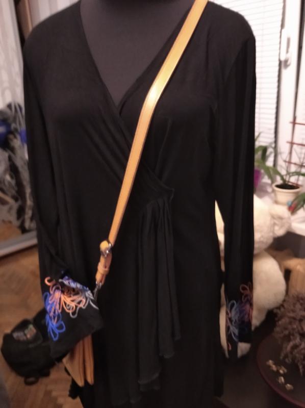 Платье приталенного силуэта, расклешено к низу, очень приятное к телу. Очень интересный рукав снизу - с абстрактным рисунком. Цвет угольно-черный. Размер 50-54. Смотрите замеры: ПОГ 52-54, ПОТ 46, ПОБ 65, плечи 42-44, рукав 67, ДИ 85 см.