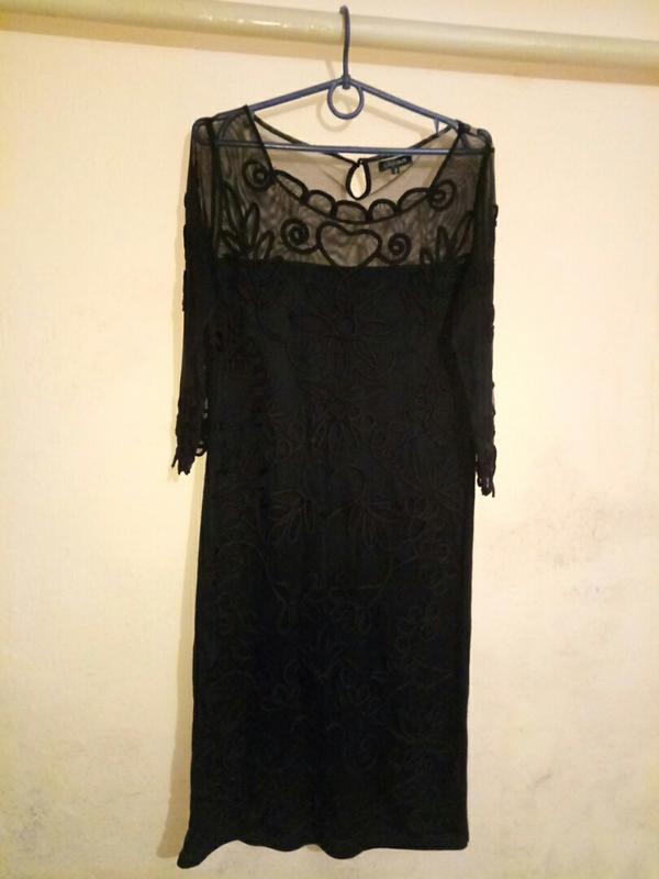 платье черного цвета, тонкая вязка-основная ткань, круглый вырез горловины, рукава 1/2, перед, рукава и верх спинки-расшитая тесьмой сетка, длина меди, выглядит очень нарядно. замеры в спокойном состоянии: грудь 39см, талия 36см, бедра 41см, рукава 40см, длина 90см
