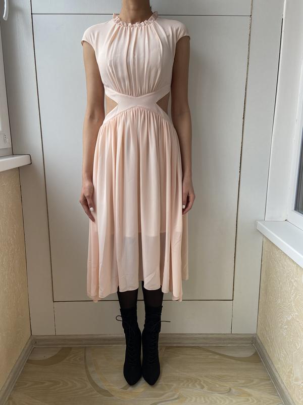 Платье с шелковым подкладом , цвет персик , параметры: размер S, полуобхват груди 40см , полуобхват талии 31см , длина изделия 111см , плечи по спине 40см. Параметры модели : 170, 88-61-89