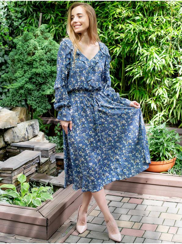 платье свободного силуэта исполнено из высококачественного штапеля в цветочный принт. Модель с V-образной горловиной, декорированной рюшей. Рукав длинный, декорированный рюшей по плечу, на резинке по низу. Платье с поясом и резинкой по линии талии. В таком платье вы будете притягивать восторженные взгляды, потому что оно сделает ваш образ незабываемым.