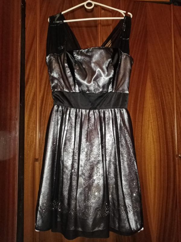 Низ из розового атласа. Верх - черная газовая ткань с серебристым напыленным рисунком. Перешивалось. Дефектов нет. Размер 42-44. Немного тянется.