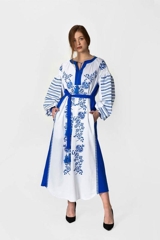 Когда душу накрывает васильковая нежность, а взгляд сияет от удовольствия, следует выбирать наряды под настроение. Бело-волошковое платье Козачка подходит для этого идеально. Вышивка также васильковая, традиционная украинская. А откуда в украинской вышивке гранаты? Они присущи вышивке казацкой старшины. Ведь казаки много путешествовали и привозили множество интересных заморских гостинцев своим женам и родным. Неудивительно, что восточное лакомство, в частности гранаты, появилось в орнаментах тогдашних украинцев. Они умело копировали их и вплетали в узоры своих вышитых изделий. Платье Казачка длиной 125 см выглядит элегантно и празднично. Вышивка обильно расположилась на пышных рукавах и спереди – она выглядит роскошно и открывает взгляд красоту и величие украинской вышивки. Платье хорошо сочетается с многочисленными вариантами обуви: то ли туфли на каблуке, то ли плоские мешки, а может и кроссовки попробовать? Почему бы и нет. Современные модницы могут позволить себе все. Ткань – натуральный высококачественный лен, гарантирующий тактильное удовольствие и комфорт.