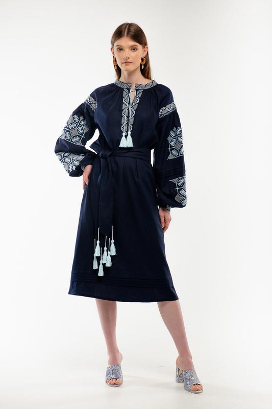 Красота и актуальность украинского национального наряда впечатляет. Увлеченные традициями родного края, мы создали модель «Наследие». Для украшения выбрали вышивку Полтавского региона, отличающуюся техникой, рисунком, цветом. На этом платье она расположена в основном на рукавах типа реглан, украшенных сборками и защелками. Внизу рукава идет сборка и манжет на резинке. Вышивка хорошо контрастирует с полотном (кстати, это натуральный лен темно-синего цвета) и привлекает внимание, но ненавязчиво. Такие решения не новаторские – мы следовали классике и получили аутентичное платье прямого силуэта с воротником-стойкой. Его длина составляет 110 см. Благодаря такому крою, платье красиво смотрится на любой фигуре. Но она будет выглядеть еще лучше с поясом, которым вы можете дополнить образ по своему усмотрению. Таким образом, модель становится более интересной и подчеркивает линию талии. Модель «Наследие» – платье, которое поможет вам создать непревзойденный самодостаточный образ, не требующий дополнительных дизайнерских вмешательств – классической обуви и лаконичных украшений хватит.