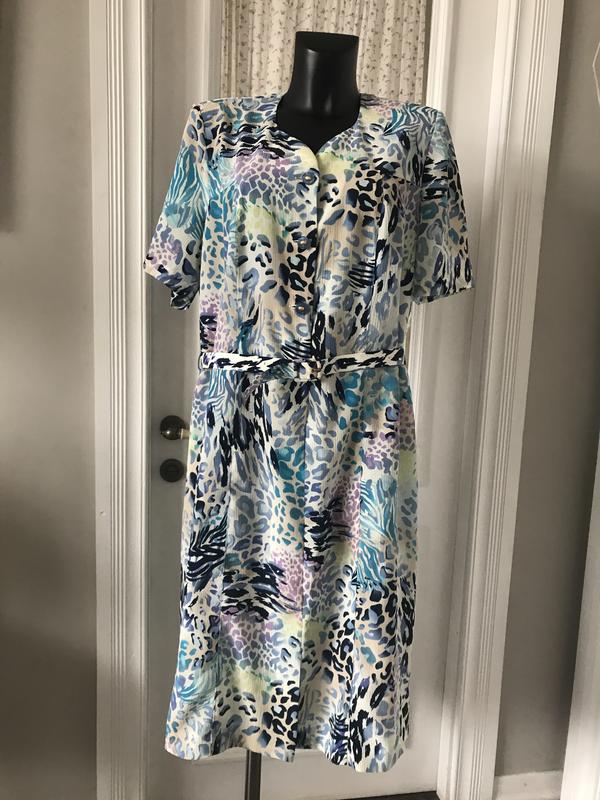 Красивое винтажное платье от французского бренда. Приятная расцветка, отличный фасон:спереди расстёгивается до линии бёдра. Есть «родной»поясок с пряжечной, . Состав:полиэстер, но очень качественный, мягкий и приятный к телу. Не мнётся. Размер по бирке -44. Замеры:длина-110 см., ПОГ-54 см, ПОТ-48 см, ПОБ-57 см. Отличное!