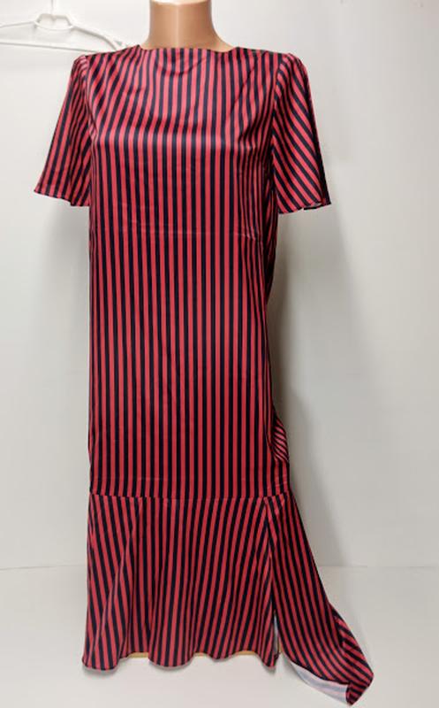 Атласное сатиновое асимметричное миди платье в полоску NA-KD Полосатое платье миди из материала, похожего на сатин. Прямой крой с асимметричным низом. Короткие рукава. На спинке застегивается на пуговицу. Размер указан 36( S/M). Ориентируйтесь на замеры!!!!! Замеры: длина- 106/116, плечи- 38, пог- 46, поб- 49, рукав- 25. Состав : 95% полиэстер, 5% эластан. 100% предоплата, доставка НП.