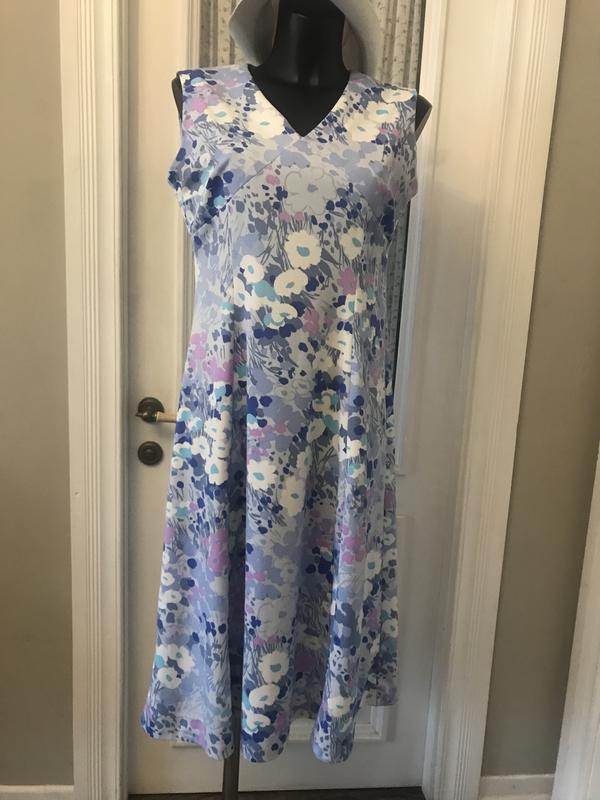 Красивое винтажное платье длиной миди . Нежная цветочная расцветка, бело-голубой тон, полуприлегающий силуэт:сзади по спинке молния до линии бедра. Красиво выполнена зона декольте. Без подкладки. Состав:высококачественный полиэстер. Размер по бирке -42. Замеры:длина:110 см, ПОГ-47 см, ПОТ-42 см, ПОБ-52 см. Ткань с эластином, хорошо тянется и садится по фигуре.