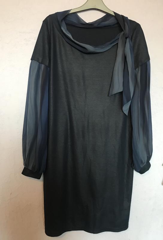 Тканина трикотаж з рукавами і хомутом з злегка прозорої тканини.Сидить по фігурі ідеально, як гарну, так і в офіс. Пог50,пот45, побіди 55, довжина 98