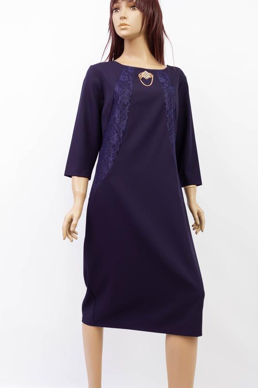 Стильное женское платье Оригинальное платье Emika синего цвета с гипюровой вставкой спереди, производство Турция. Платье приталенное, длина по колено. Ткань мягкая, немного тянется, без подкладки. Воротник круглый, украшенный золотистой вставкой. Юбка прямая. Застегивается платье на молнию сзади. Рукава три четверти. Размеры: 48,50,52,54 (на этикетке указан 42,44,46,48 европейский) 48 ПОГ 50, ПОТ 44, ПОБ 50, плечи 42, рукава 44, длина 109 50 ПОГ 52, ПОТ 46, ПОБ 52, плечи 43, рукава 44, длина 109 52 ПОГ 54, ПОТ 48, ПОБ 54, плечи 45, рукава 45, длина 109 54 ПОГ 56, ПОТ 50, ПОБ 56, плечи 46, рукава 45, длина 109 Состав: 88% полиэстер, 12% эластан