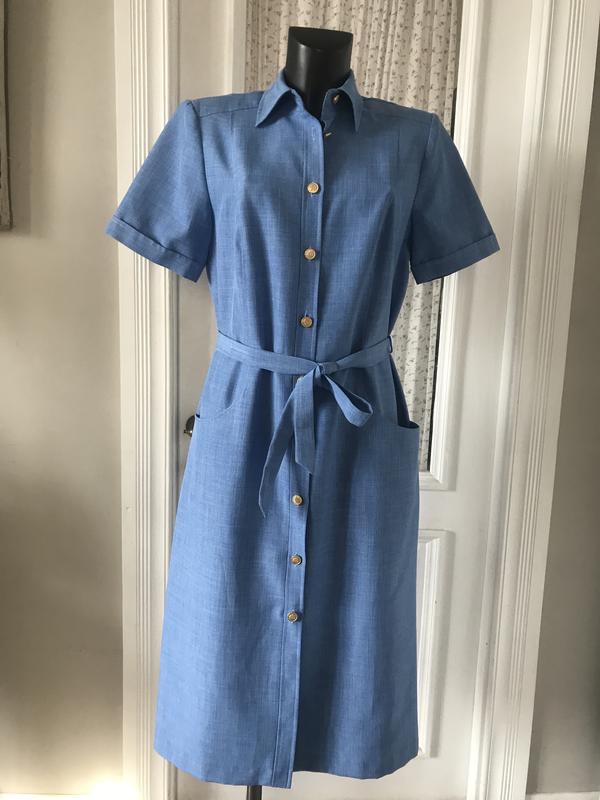 Красивое винтажное платье-халат длиной миди. Отличный крой, шикарный декор в виде золотых пуговичек, «родной»поясок. Идеальное состояние! Не мнётся, состав:полиэстер отливного качества. Даа глубоких кармана! Размер по бирке-40. Замеры:длина-113 см, ПОГ-51 см, ПОТ-49 см, ПОБ-52 см. Красивое!