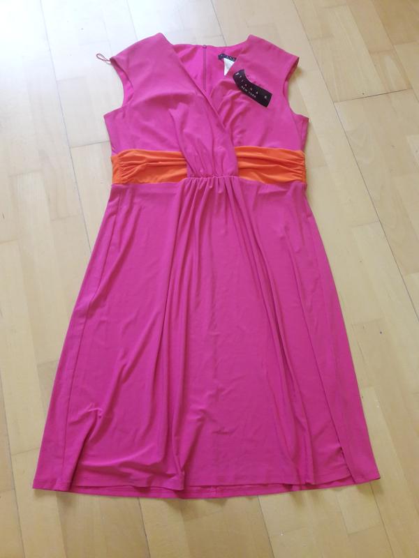 Платье розового цвета с деталями оранжевого цвета. Бренд Tiana New York. Размер 16. Полиесте 95 %, эластан 5%. ПОГ 50 см, ПОТ 43 см, ПОБ 56 см, длина 100 см.