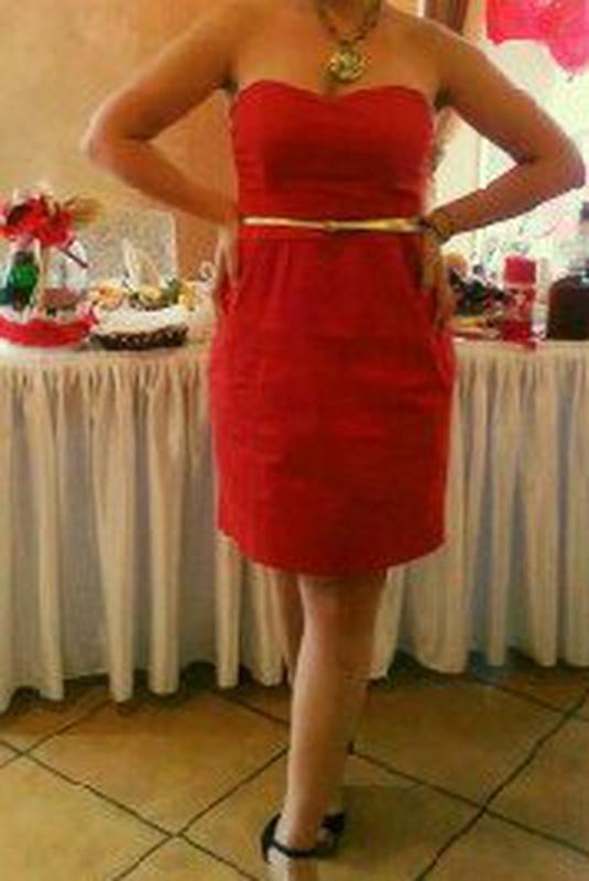 Очень стильное платье без бретелек. Отличное качество, на платье по бокам есть карманы. Длина 74см.