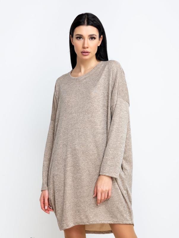 платье - кокон из мягкого трикотажа, бежевый меланж , длина миди