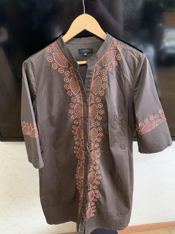Коричневое платье на пуговицах с узором, короткий рукав, 46 размер Внутри хлопковая подкладка, состав на фото